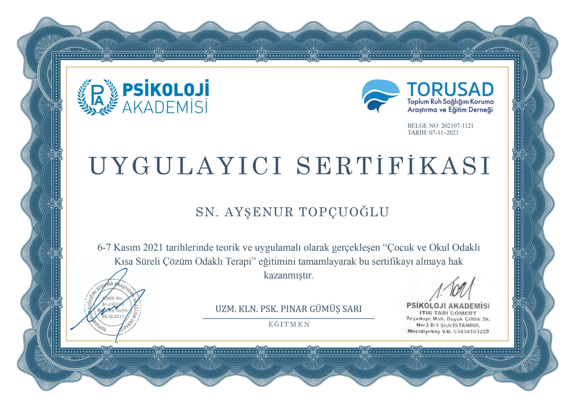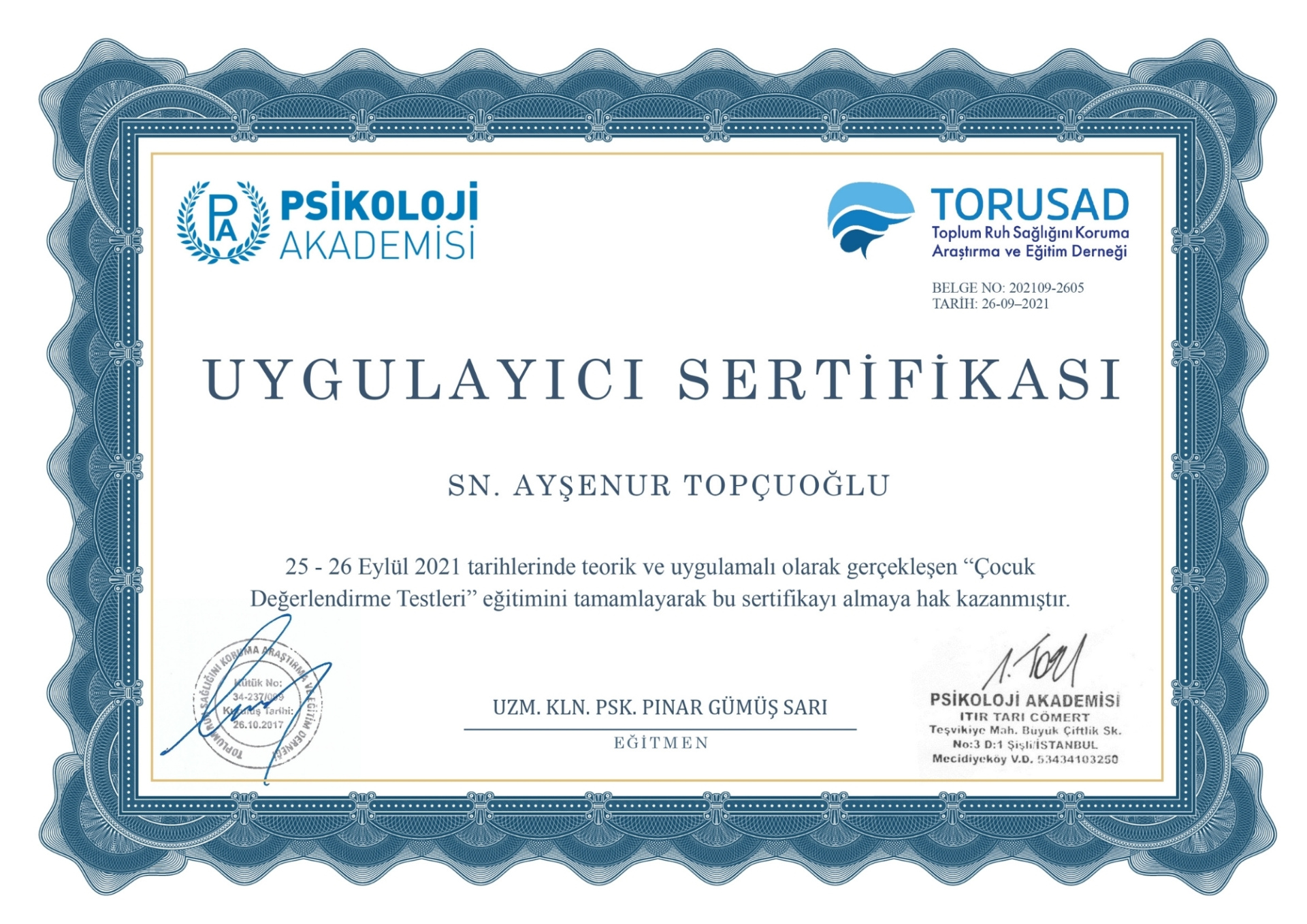 Klinischer Psychologe, Psk. Ayşenur TOPÇUOĞLU wurde 1995 in Kadıköy geboren. 2019 schloss er sein Studium an der Fakultät für Psychologie der Şehir-Universität Istanbul ab. 2021 schloss er sein Masterprogramm in Klinischer Psychologie an der Fatih Sultan Mehmet Foundation University ab. Er setzt sein Berufsleben im Private Ümran Medical Center fort.